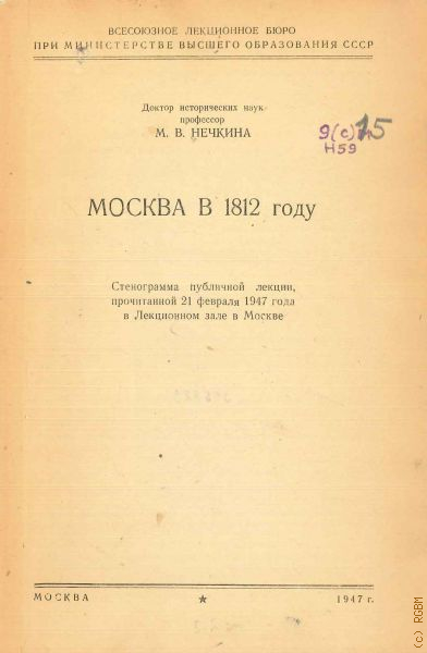 Нечкина М.В., Москва в 1812 году. Стенограмма публ. лекции, прочит. 21 февр. 1947 г. в Лекц. зале в Москве — 1947