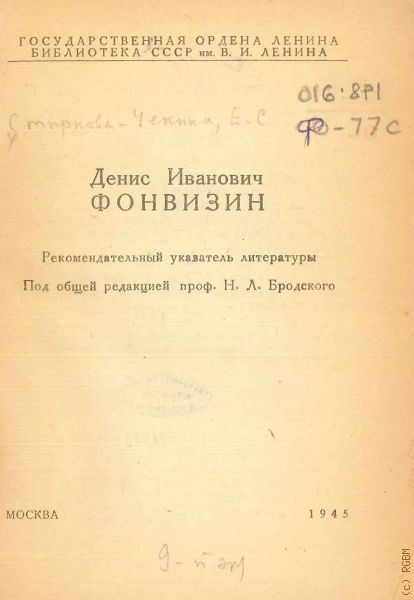 Смирнова-Чикина Е.С., Денис Иванович Фонвизин. Рекоменд. указатель лит-ры — 1945