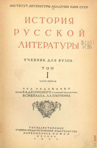История русской литературы. Учебник для вузов: [Утв. НКП РСФСР] Т. 1., ч. 1: [XI-XVII вв.] — 1943