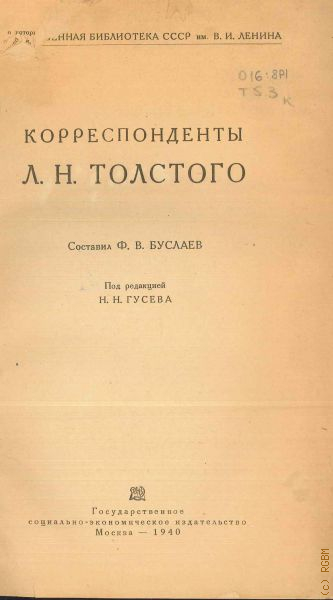 Корреспонденты Л. Н. Толстого. [аннотир. кат. писем] — 1940