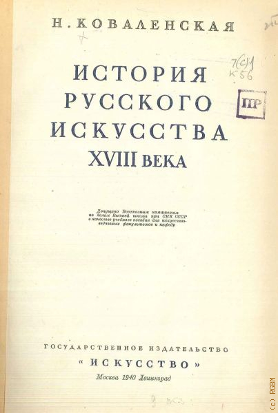 Коваленская Н.Н., История русского искусства XVIII века. Допущено ВКВШ при СНК СССР в качестве учеб. пособия для искусствовед. фак-тов и кафедр — 1940