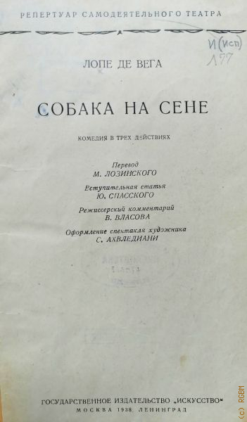 Лопе де Вега Ф., Собака на сене. Комедия в 3 д. — 1938 (Репертуар самодеятельного театра)