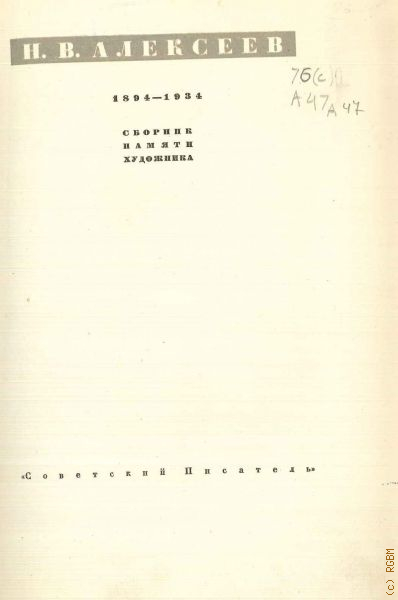 Посмертное издание. Алексеев Н. В., 1894-1934 гг., русский советский художник, график. Один из самых талантливых и известных художников-графиков, "вступивших в строй после Октября и сумевших претворить уроки "мироискуснической" графики в новые формы, найти своеобразный графический почерк, по-своему увидеть и воспроизвести черно-белый мир линий и пятен" (Э. Голлербах. "Графика Н. В. Алексеева"). Алексеев умер молодым в 1934 году от туберкулеза, но имя его в искусстве графики не забыто, а такие работы, как иллюстрации к "Игроку" Достоевского (1927), к "Кроткой" Достоевского (1933), к "Мертвым душам" Гоголя (1930) прочно заняли место в ряду русской классической графики двадцатых, тридцатых годов. В сборнике приводится полная библиография жизни и творчества художника. Алексеев Николай Васильевич, родился в 1894 году в Моршанске, умер в 1934 г. в Ленинграде от туберкулеза. Учился в Киевском художественном училище у Ф. Кричевского и в ленинградском Вхутеине у Д. Митрохина. Автор многочисленных работ в книжной графике для самых крупных советских издательств: ГИЗ и Гослитиздат. Ценнейший сборник для библиографов и историков русского искусства первой половины двадцатого века