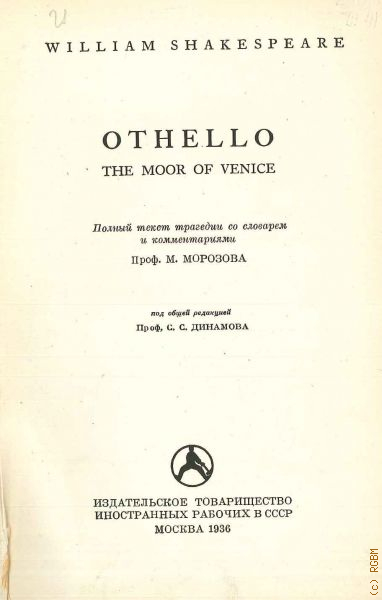 Пьеса Уильяма Шекспира "Отелло, венецианский мавр" c комментариями советского литературоведа, театроведа, критика, педагога и переводчика М.М. Морозова (1897-1952)