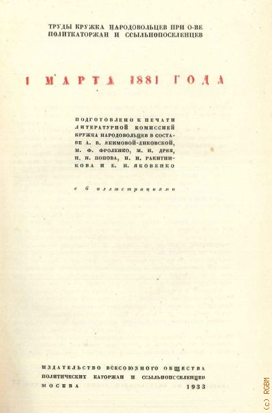 Общество бывших политкаторжан и ссыльнопоселенцев, 1 марта 1881 года — 1933 (Труды кружка народовольцев при о-ве политкаторжан и ссыльнопоселенцев)