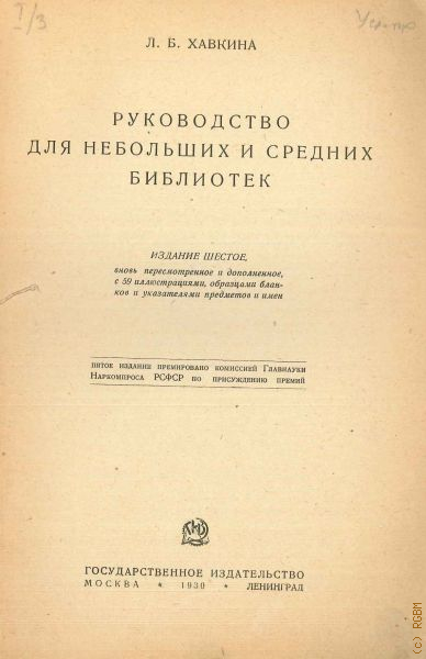Хавкина Л.Б., Руководство для небольших и средних библиотек — 1930