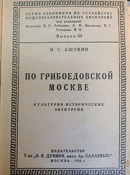 Ашукин Н.С., По Грибоедовской Москве. Культурно-исторические экскурсии — 1924 (Серия сборников по устройству общеобразовательных экскурсий. Под ред. Ашукина, Н. С., Лебедева, А. М. [и др.]. Вып. 3)