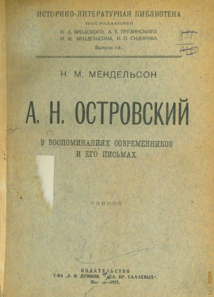 Мендельсон Н.М., Александр Николаевич Островский в воспоминаниях современников и его письмах — 1923 (Историко-литературная библиотека. Под ред. Н. Л. Бродского, А. Е. Грузинского, Н. М. Мендельсона, Н. П. Сидорова. Вып. 1)