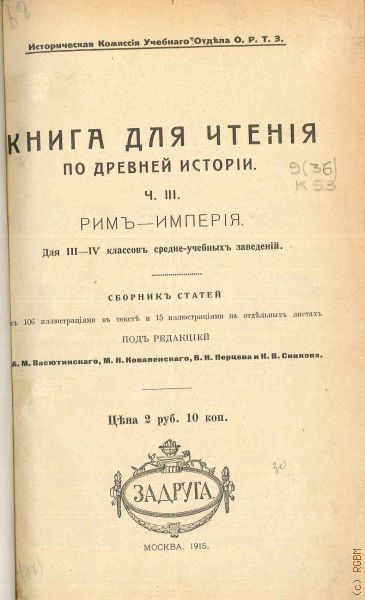 Книга для чтения по древней истории. Для 3-4 кл. средне-учеб. заведений. Сб. ст. под ред. А.М. Васютинского, М.Н. Коваленского, В.Н. Перцева и К.В. Сивкова. — 1913-1915