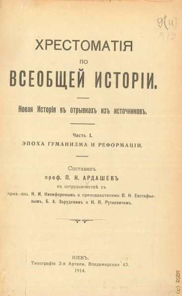 Ардашев П.Н., Хрестоматия по всеобщей истории. Новая история в отрывках из источников. Ч. 1: Эпоха гуманизма и реформации — 1914