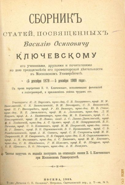 Барсков Я.Л., Сборник статей, посвященных Василию Осиповичу Ключевскому его учениками, друзьями и почитателями ко дню тридцатилетия его профессорской деятельности в Московском университете (5 декабря 1879 - 5 декабря 1909 года) — 1909