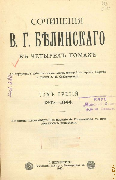 Белинский В.Г., Сочинения В.Г. Белинского в 4 т. Т. 3: 1842 - 1844. С портр. и собранием писем автора, гравюрой с картины Наумова и статьей А.М. Скабичевского — 1910