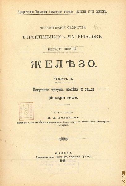 Механические свойства строительных материалов. Вып. 6-й: Железо. Часть I.: Получение чугуна, железа и стали (Металлургия железа) — 1908