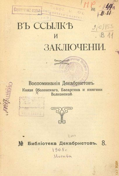 В ссылке и заключении : Воспоминания декабристов. Князя Оболенского, Басаргина и княгини Волконской — 1908 (Библиотека декабристов. — 8)