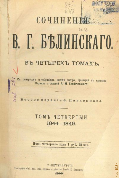 Белинский В.Г., Сочинения В.Г. Белинского в 4 т. Т. 4: 1844 - 1849. С портр. и собранием писем автора, гравюрой с картины Наумова и статьей А.М. Скабичевского — 1900