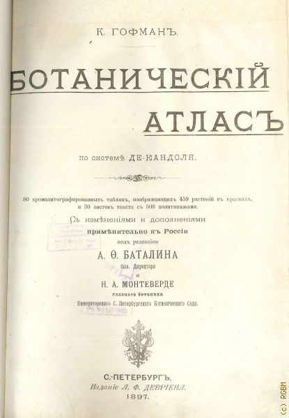 Гофман Карл, Ботанический атлас по системе де-Кандоля. 80 хромолит. табл., изображающих 459 растений в красках, и 30 л. текста с 508 политипажами : С изм. и доп. применительно к России / К. Гофман; Под ред. А.Ф. Баталина б. дир. и Н.А. Монтеверде, гл. ботаника Имп. С.-Петерб. ботанич. сада — 1897