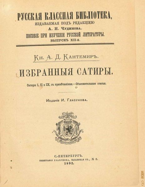Кантемир А.Д., Избранные сатиры. Объяснительные статьи. Сатиры I, II и IX, с прим. — 1892 (Русская классная библиотека. изд. под редакцией А.Н. Чудинова. Пособие при изуч. рус. лит.. Вып. 12)