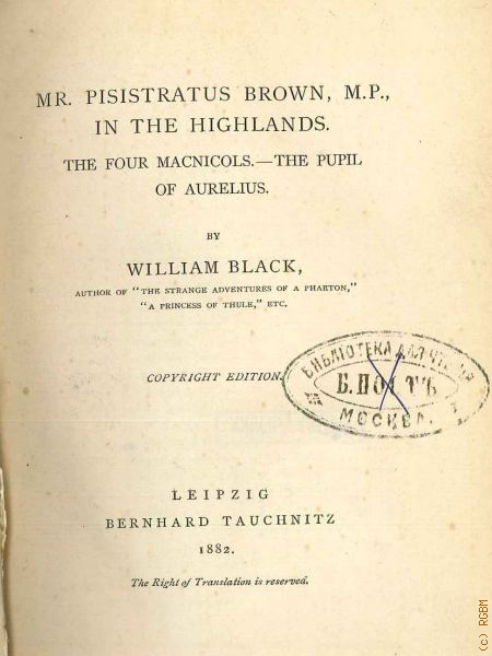 Black W., Mr. Pisistratus Brown, M.P., in the Highlands. The four MacNicols. The pupil of Aurelius — 1882 (Collection of British authors. Vol.2048)