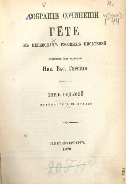 Гёте И.В., Собрание сочинений Гете в переводах русских писателей, изданных под редакцией Ник. Вас. Гербеля. Т. 7 : Путешествие в Италию — 1879