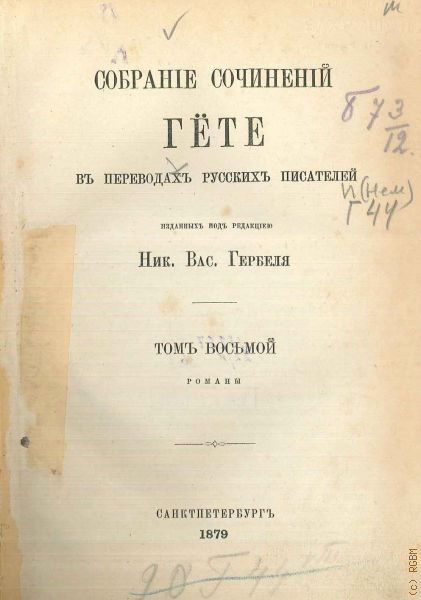 Гёте И.В., Собрание сочинений Гете в переводах русских писателей, изданных под редакцией Ник. Вас. Гербеля. Т. 8 : Романы — 1879