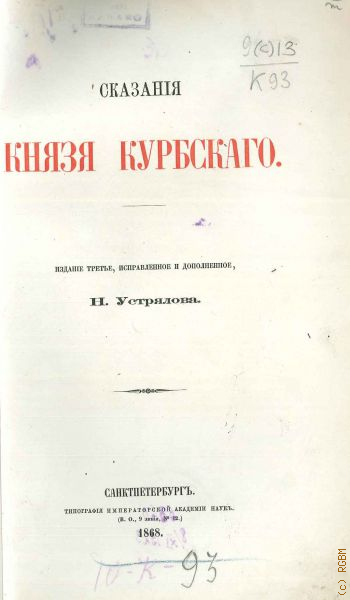 Содержание: Оглавление: О жизни и сочинениях князя Курбского / Н.У. I. История ИоаннаГрозного; II. Переписка Курбского с Грозным; III. Письма Курбского к разным лицам. IV История Флорентийского собора. II. Предисловие к Новому Маргариту; Приложения: Примечания. Синодик Иоанна Грозного. Акты Литовской метрики. Изъяснение плана осады Казани. Словарь иностранных и старинных речений. Указатель.