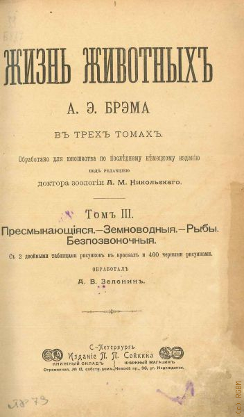 Брем А.Э., Пресмыкающиеся.- Земноводные.- Рыбы. Безпозвоночные. С 2 двойными таблицами рисунков в красках и 460 черными рисунками. Жизнь животных Т. 3 — [1902]
