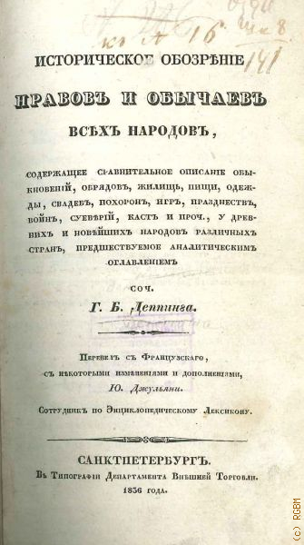 Деппинг Ж.Б., Историческое обозрение нравов и обычаев всех народов, содержащее сравнительное описание обыкновений, обрядов, жилищ, пищи, одежды... и проч., у древних и новейших народов различных стран, предшествуемое аналитическим оглавлением — 1836