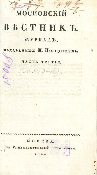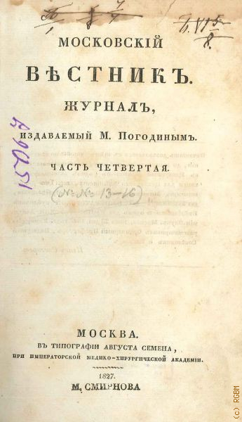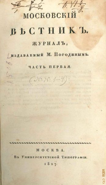 Московский вестник. Журнал, издаваемый М. Погодиным.Ч. 1, — I-IV. — 1827