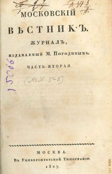 Московский вестник. Журнал, издаваемый М. Погодиным.Ч. 2, — V-VIII — 1827