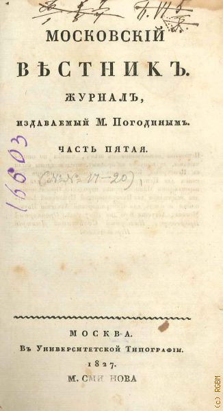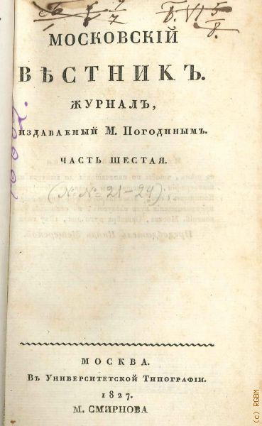 Статус: КНИЖНЫЙ ПАМЯТНИК ФЕДЕРАЛЬНОГО УРОВНЯ. Старопечатное издание гражданского шрифта первой четверти XIX века. С 1827 по 1830 годы М. П. Погодин издавал журнал "Московский вестник", публикуя в нём в основном статьи по философии, эстетике, литературе и истории, а также свои рецензии, переводы и произведения в прозе. Рассчитанный на серьёзного и вдумчивого читателя, журнал не заинтересовал обычных читателей, которые желали более простого и развлекательного "чтива". Поэтому, не набрав должного количества подписчиков, журнал Погодина по прошествии трёх лет был закрыт. Сохранность книжного блока хорошая. Cоставной переплет эпохи, крышки оклеены "мраморной" бумагой, корешок и углы из коричневой кожи, на корешке тиснение золотом: растительный орнамент в виде цветков, наименование издания и номер части "Московск. вестникъ 1.".В нижней части корешка переплета — имя бывшего владельца (золотым тиснением): «М.Смирнов».