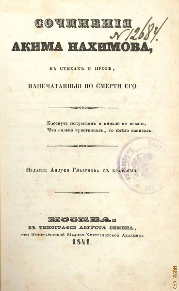 Нахимов А.Н., Сочинения Акима Нахимова в стихах и прозе, напечатанные по смерти его — 1841