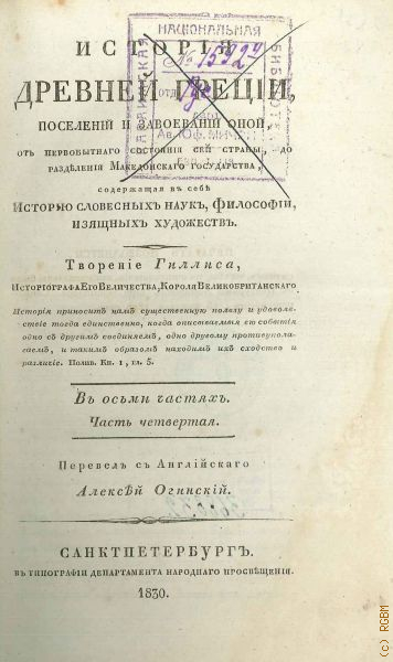 Гиллис Д., История древней Греции, поселений и завоеваний оной, от первобытного состояния сей страны, до разделения Македонского государства, содержащая в себе историю словесных наук, философии, изящных художеств — 1830