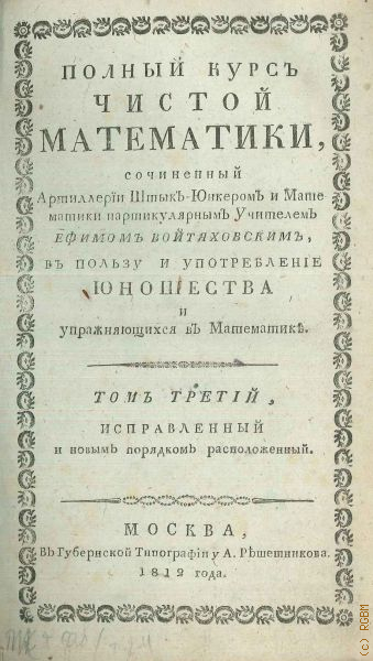 Войтяховский Е.Д., Полный курс чистой математики, сочиненный артиллерии штык-юнкером и математики партикулярным учителем Ефимом Войтяховским, в пользу и употребление юношества и упражняющихся в математике — 1812