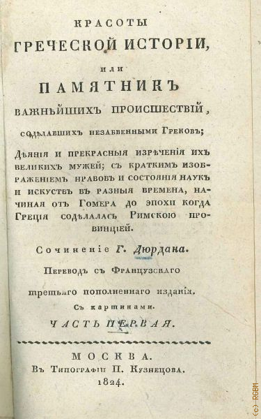 Дюрдан Р. Ж., Ч. 1. Красоты греческой истории, или Памятник важнейших происшествий, соделавших незабвенными Греков; Деяния и прекрасные изречения их великих мужей; с кратким изображением нравов и состояния наук и искусств в разные времена, начиная от Гомера до эпохи когда Греция соделалась Римской провинцией — 1824