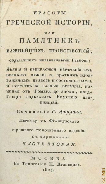 Дюрдан Р. Ж., Красоты греческой истории, или Памятник важнейших происшествий, соделавших незабвенными Греков; Деяния и прекрасные изречения их великих мужей; с кратким изображением нравов и состояния наук и искусств в разные времена, начиная от Гомера до эпохи когда Греция соделалась Римской провинцией. Перевод с Французского третьего пополненного издания. С картинами. Ч. 1-2 — 1824