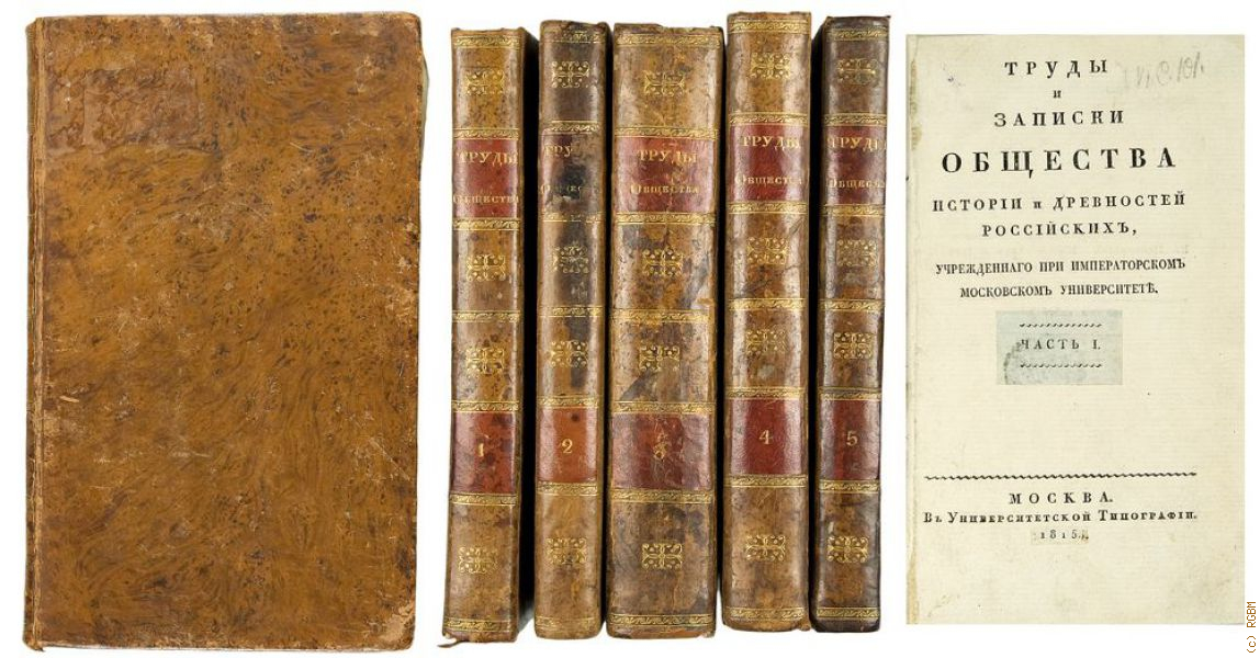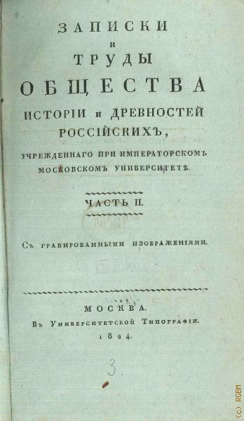 Статус: КНИЖНЫЙ ПАМЯТНИК ФЕДЕРАЛЬНОГО УРОВНЯ. Старопечатное издание гражданского шрифта первой четверти XIX в. Общество истории и древностей Российских, учрежденное при Императорском Московском Университете, и с высочайшего соизволения утвержденное господином министром народного просвещения, графом Алексеем Кирилловичем Разумовским, занимаясь изданием Нестора и других летописей и достопамятностей российских, положило также "издавать ежегодно по одной книжке актов, состоящих как из рассуждений, которые члены читают по временам в Обществе, так и из всех происшествий, до Общества относящихся, с описанием заседаний. Первая часть сих актовна 1811-й год, под именем Записок и Трудов Общества, давно уже была готова, но, по причине известных несчастных обстоятельств московских, не могла выйти в свет в свое время. Теперь же по благополучном окончании военных бедствий, Общество, возвратясь к обыкновенным своим занятиям, первым долгом поставило выполнить принятую на себя обязанность... В кн. печать: "CCCР. Институт К. Маркса и Ф. Энгельса"