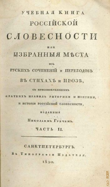 Учебная книга российской словесности, или Избранные места из русских сочинений и переводов в стихах и прозе, с присовокуплением кратких правил риторики и пиитики, и истории российской словесности, изданные Николаем Гречем. Ч. 2 — 1820