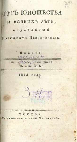 Статус: КНИЖНЫЙ ПАМЯТНИК ФЕДЕРАЛЬНОГО УРОВНЯ. Старопечатное издание гражданского шрифта первой четверти XIX в. На шмуцтит. штамп: "Дар Педагогическому Институту имени П.Г. Шелапутина от семьи И. А. Баранова в 1917 г.", а так же печать: "Библиотека Педагогического института имени П.Г. Шелапутина".