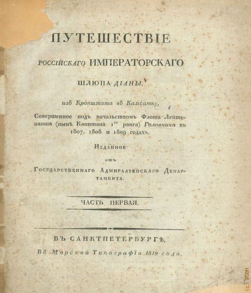 Головнин В.М., Путешествие российского императорского шлюпа Дианы, из Кронштадта в Камчатку, совершенное под начальством флота лейтенанта (ныне капитана 1-го ранга) Головнина в 1807, 1808 и 1809 годах — 1819