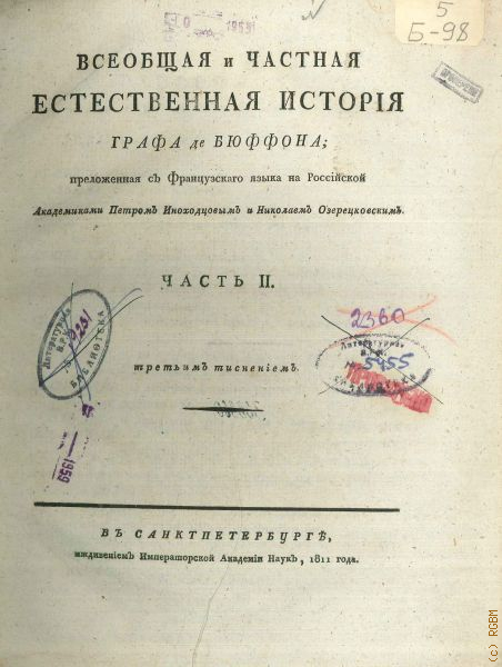 Бюффон Ж.Л.Л. де, Ч. 2. Всеобщая и частная естественная история графа де Бюффона, переложенная с французского языка на российский... — 1811