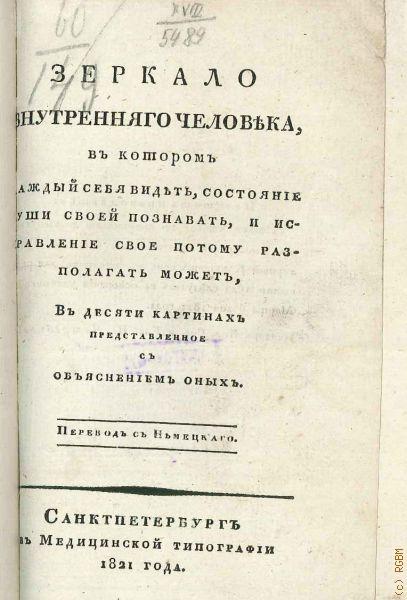 Статус: КНИЖНЫЙ ПАМЯТНИК ФЕДЕРАЛЬНОГО УРОВНЯ. Старопечатное издание гражданского шрифта первой четверти XIX в. «Зеркало внутреннего человека» (без указания автора). Выходило тремя изданиями: СПб., 1819, 1821 и 1822 гг. В предисловии говорилось, что оригинал этой немецкой книги называется «Das Hers des Mehschen ein Tempel Gottes, Oder eine Werkstatte des Satana», она была издана в 1812 г. и переведена на большинство европейских языков и 23 неевропейских языка. Автором данного произведения является Госснер Иоганн Евангелиста (1773-1858) — католический священник из Мюнхена, активный деятель Российского библейского общества, выслан в 1824 г. из России за публикацию произведений, содержащие нападки на Православие. О нем см. Кондаков Ю. Либеральное и консервативное направления в религиозных движениях в России первой четверти XIX века. Гл. 3: «Дело Госснера»
