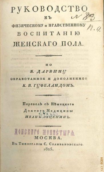 Статус: КНИЖНЫЙ ПАМЯТНИК ФЕДЕРАЛЬНОГО УРОВНЯ. Старопечатное издание гражданского шрифта первой четверти XIX в. Переработка труда Е. Дарвина "Plan for the conduct of female education" (Derby, 1797). Как отмечает Гуфеланд, "прибавления мои составляют более, нежели половину всего сочинения. Следовательно, оно уже не принадлежит ни Дарвину, ни мне, а обоим нам вместе" (с. VI)