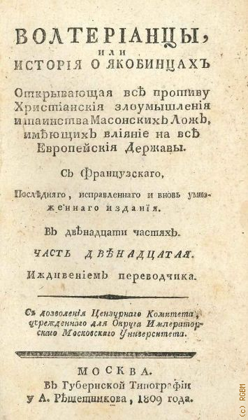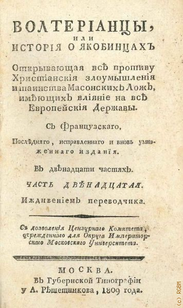 Баррюель О., Волтерианцы, или История о якобинцах, открывающая все противу христианския злоумышления и таинства масонских лож, имеющих влияние на все европейския державы:. С французскаго. Последняго, исправленнаго и вновь умноженнаго издания. В 12 ч. Ч. 1-12 — 1805-1809