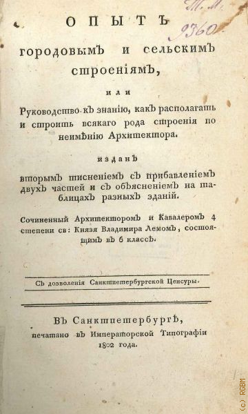 Лем И., Опыт городовым и сельским строениям, или Руководство к знанию, как располагать и строить всякаго рода строения по неимению архитектора. Издан вторым тиснением с прибавлением двух частей и с объяснением на таблицах разных зданий — 1802