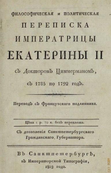 Екатерина, Философическая и политическая переписка императрицы Екатерины II с доктором Циммерманом, с 1785 по 1792 год — 1803