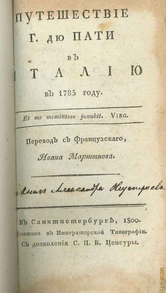 Старопечатное издание гражданского шрифта первой четверти XIХ в. На форзаце экслибрис: "Библиотека Д.М. Остафьева"