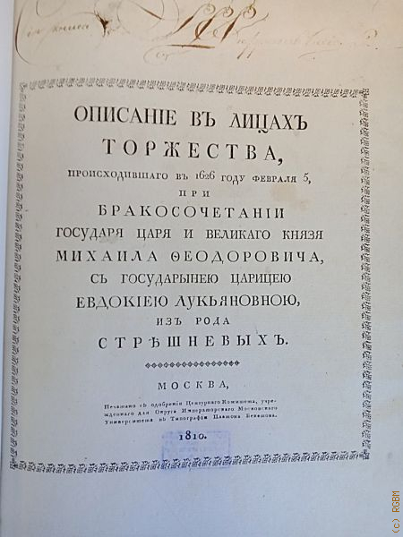 Описание в лицах торжества, происходившего в 1626 году февраля 5; при бракосочетании государя царя и великого князя Михаила Феодоровича, с государынею царицею Евдокией Лукьяновной из рода Стрешневых — 1810