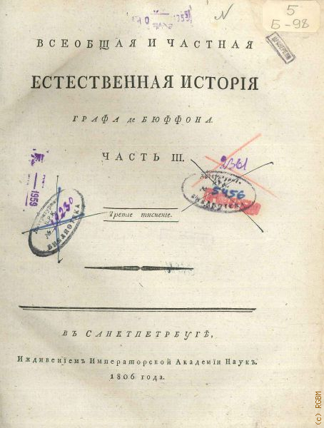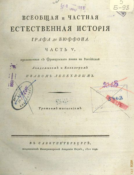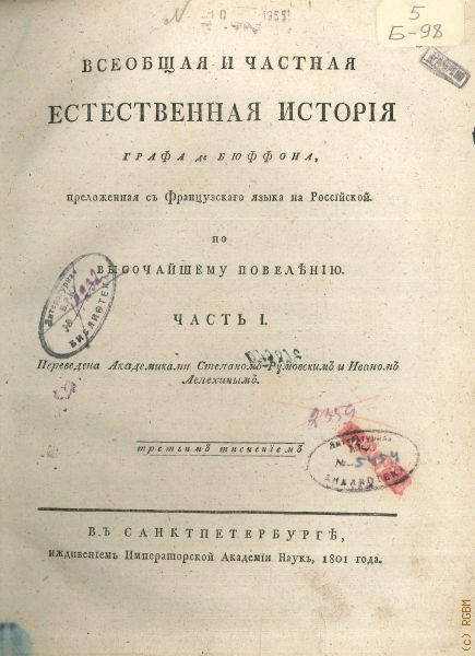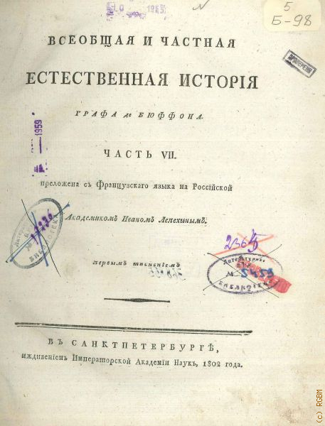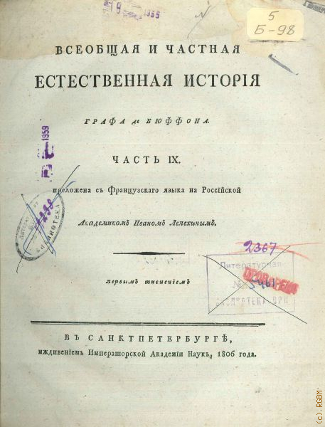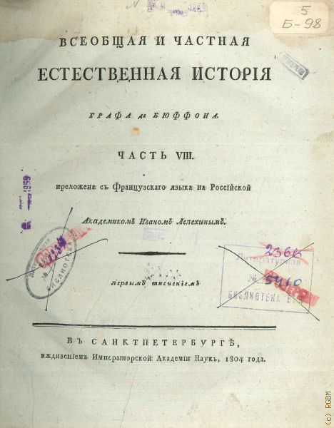 Статус: КНИЖНЫЙ ПАМЯТНИК ФЕДЕРАЛЬНОГО УРОВНЯ. Старопечатное издание гражданского шрифта первой четверти XIX в. Жорж-Луи Леклерк, граф де Бюффон — французский натуралист, биолог, математик, естествоиспытатель и писатель XVIII века. Высказал идею о единстве растительного и животного мира. С научной точки зрения сочинения Бюффона имеют сегодня мало значения, между тем как они всё ещё представляют собой образец ораторского, иногда высокопарного стиля.