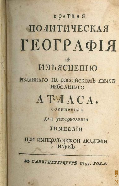 Статус: КНИЖНЫЙ ПАМЯТНИК ФЕДЕРАЛЬНОГО УРОВНЯ. Старопечатное издание гражданского шрифта XVIII в. В кн. дарственная надпись: "Читателям Российской Государственной Юношеской библиотеки дарю эту книгу, по которой может быть учились такие люди как Ломоносов, Державин, Карамзин... историк и географ Б. Рыбаков 21.03.1996 года", а также штамп: "ИЗЪ КНИГЪ Виктора Михайловича ЛОМ?НЪ". Приплетена 1 кн.: Краткое руководство к географии.- [СПб.,1741], а также листы Атласа 1737 г.