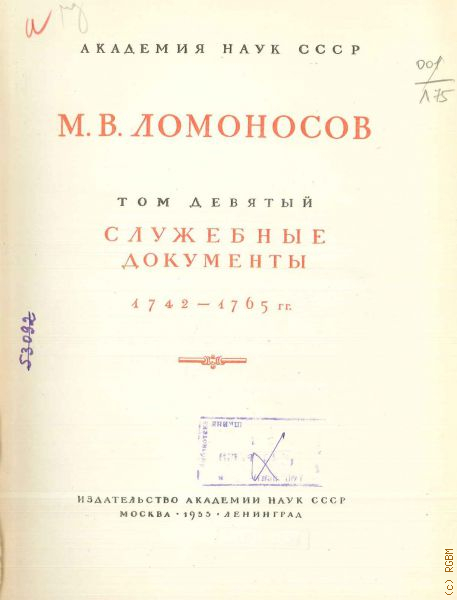 Ломоносов М.В., Полное собрание сочинений. Т.9: Служебные документы. 1742-1765 гг. — 1955